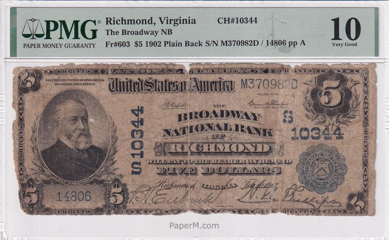 | 5 Dollars Plain Back, Broadway National Bank, Richmond, VA | |||||
