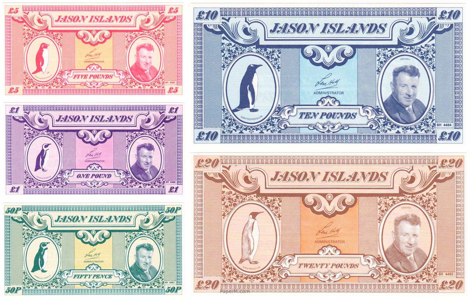 50 Pence, 1, 5, 10, 20 Pounds - Set of 5 Notes; Private issue by Leonard Hill, director of Zoo in Gloucester, England, and owner of Jason Islands (northwest part of Falkland Islands). Jason Islands are inhabited only by penguins. The notes were sold to rise a funds for the Jason Islands Trust to preser |